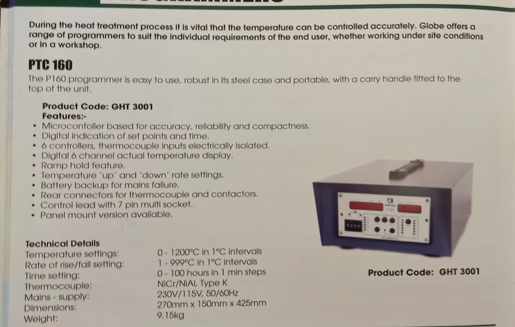 یک واحد برنامه نویس فشرده و عملیات حرارتی که برای استفاده با طیف وسیعی از ترانسفورماتورهای منبع نیرو عملیات حرارتی سیار Globe برای برنامه ریزی و کنترل فرآیندهای عملیات حرارتی طراحی شده است. PTC160 سرعت افزایش دما، دمای نگهداری، زمان نگهداری و نرخ کاهش دما را تا شش ناحیه کنترلی به دنبال یک پروفایل کنترل دما برنامه ریزی شده با دقت کامل کنترل می کند.